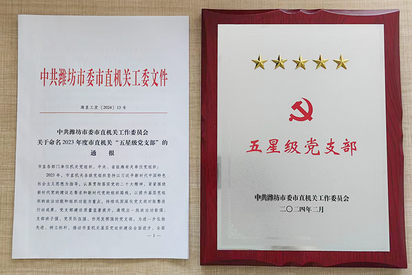 濰坊豐華(集團)公司黨委緊抓基層黨組織建設工作,積極推動黨支部標準化規范化走深走實,公司第一黨支部榮獲2023年度濰坊市委市直機關“五星黨支部”榮譽稱號。
